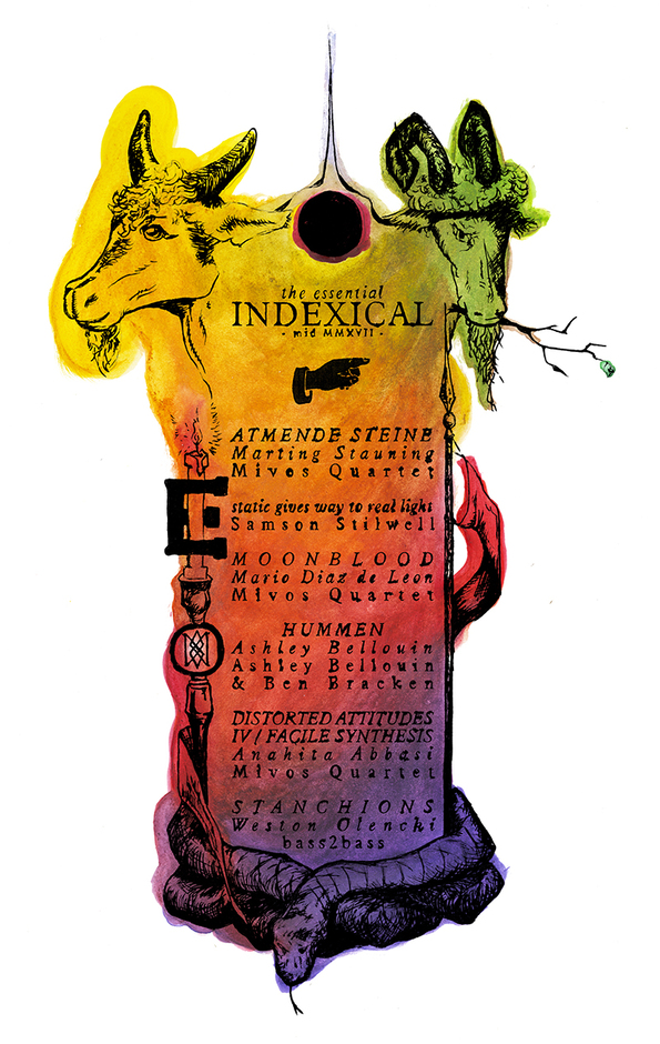 Indexical announces The Essential Indexical: Mid MMXVII, a compilation of two hours of live and live-in-studio recordings of experimental and new chamber music from Santa Cruz, California. Mid MMXVII spans genres and disciplines, from compositions recorded by the New York-based Mivos Quartet to live electronic sets of atmospheric work by Samson Stilwell and Ashley Bellouin & Ben Bracken, to Weston Olencki’s multi-part piece for five-string bass duo Bass2Bass.